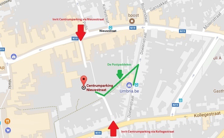 Parkeer op de CENTRUMPARKING NIEUWSTRAAT (inrit via Nieuwstraat of Kollegestraat). Het eerste uur is steeds gratis via een parkeerticket.