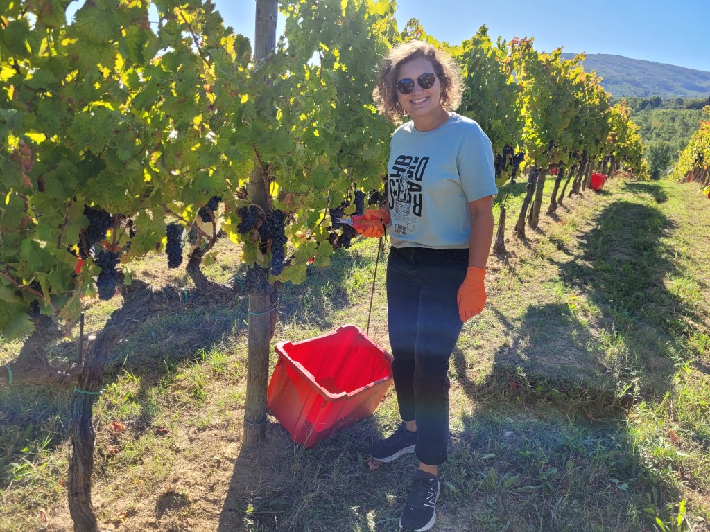 Alle druiven worden hier met de hand geplukt, een intensief teamwerk. Met handschoenen en een oogstschaar gaan we in ploegen de rijen in de wijngaard af. We kiezen enkel de perfect gave trossen en laten de gedroogde of gehavende hangen. Het blijkt al snel fysiek zwaarder werk door het constante bukken, de zware kistjes druiven en de oneffen ondergrond waarop we werken. Gelukkig is het goed weer vandaag: zonnig, maar niet te warm. Samen met ons team Olmobuco (naar de gelijknamige wijn Olmobuco) halen we in een half uur tijd maar liefst 300 kg rijpe, gezonde druiven op.